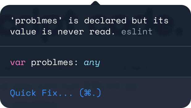 O ESLint analisa estaticamente seu código para encontrar problemas rapidamente. É implementado na maioria dos editores de texto e você pode usá-lo como parte de seu processo de integração contínua.